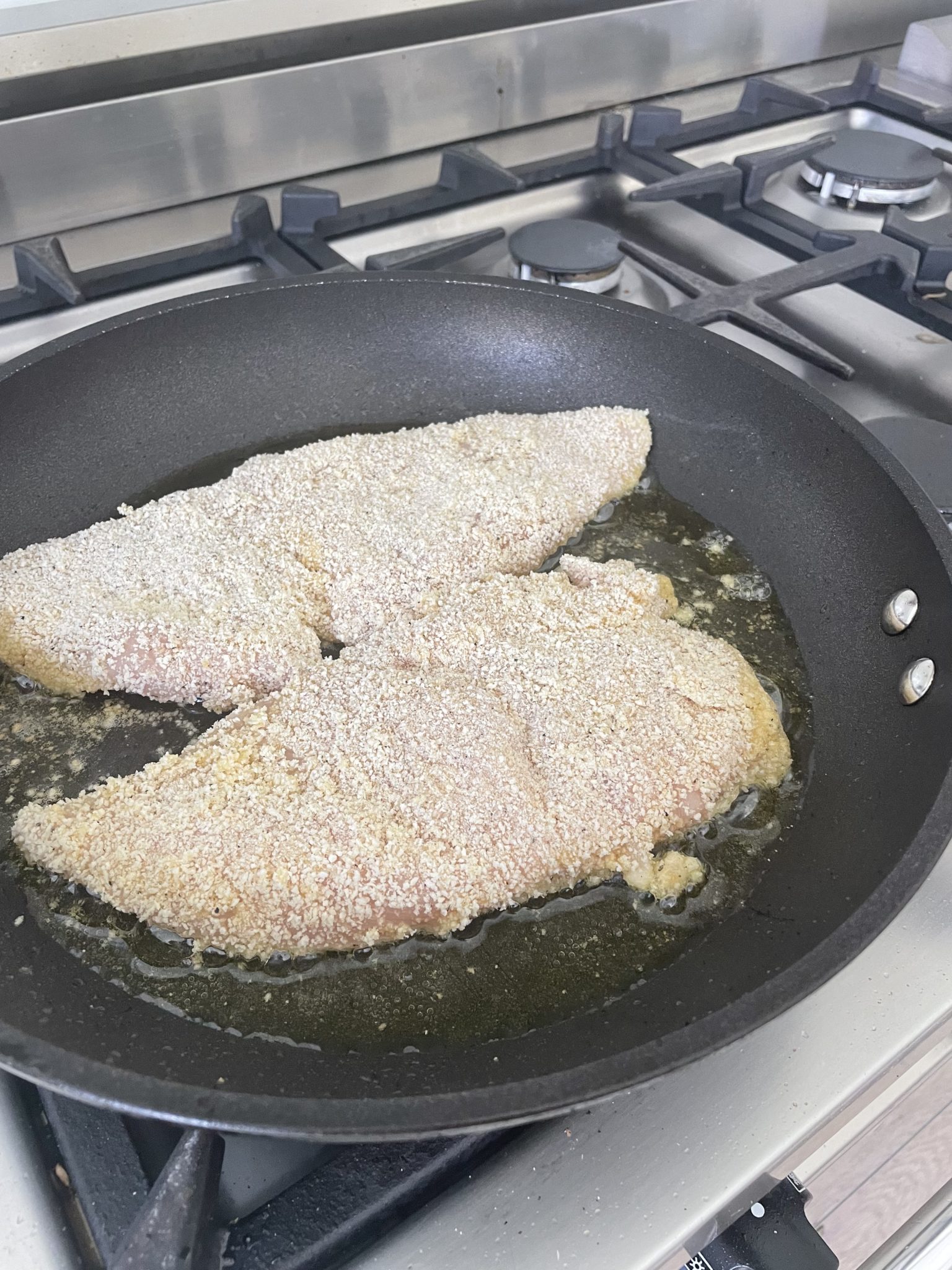 Fry the breaded chicken in olive oil over medium heat, flipping halfway, and cook until done.