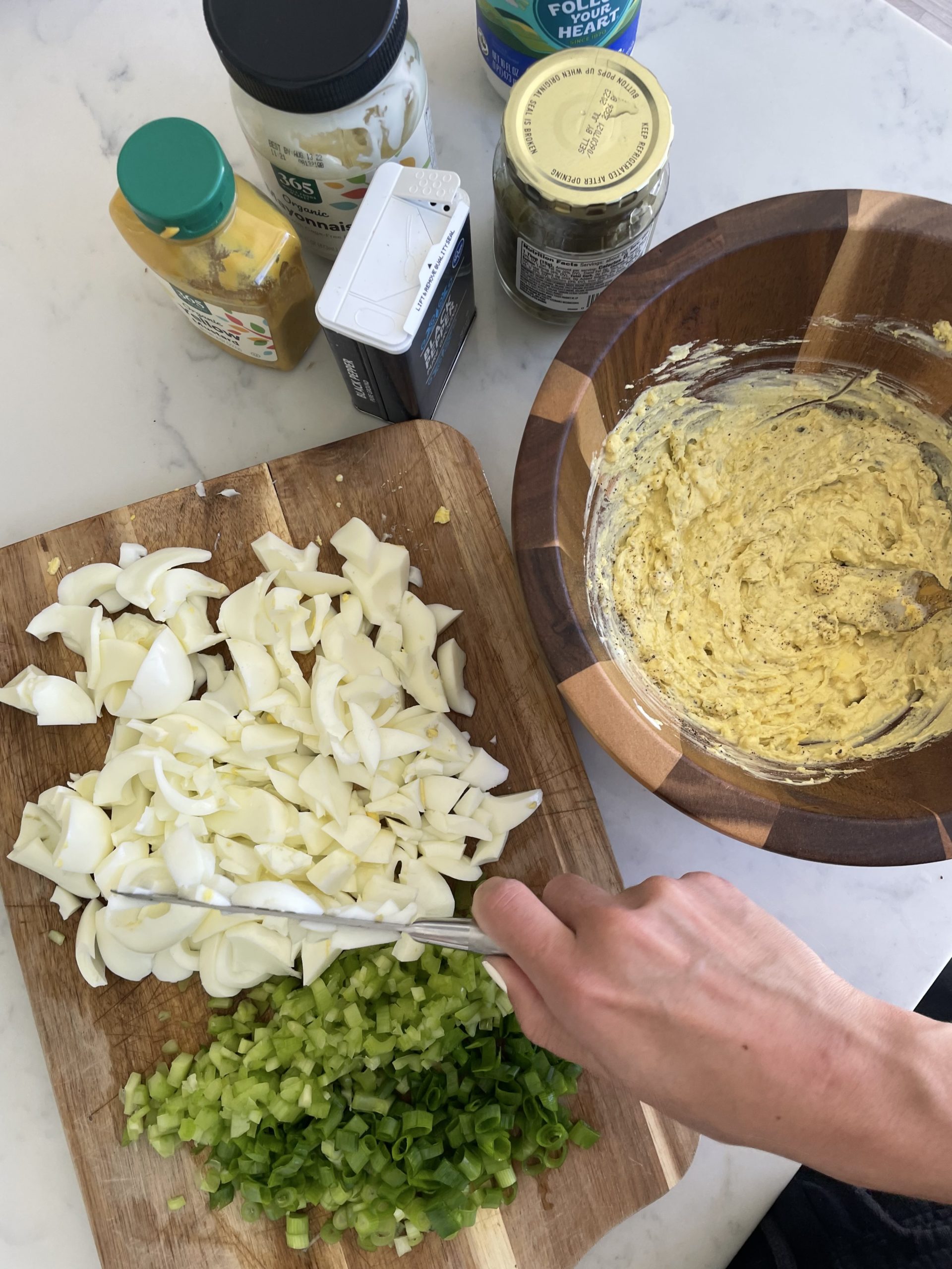 Hard boil the eggs. Then dice up the celery, green onion, and fresh dill. I like my celery super fine.