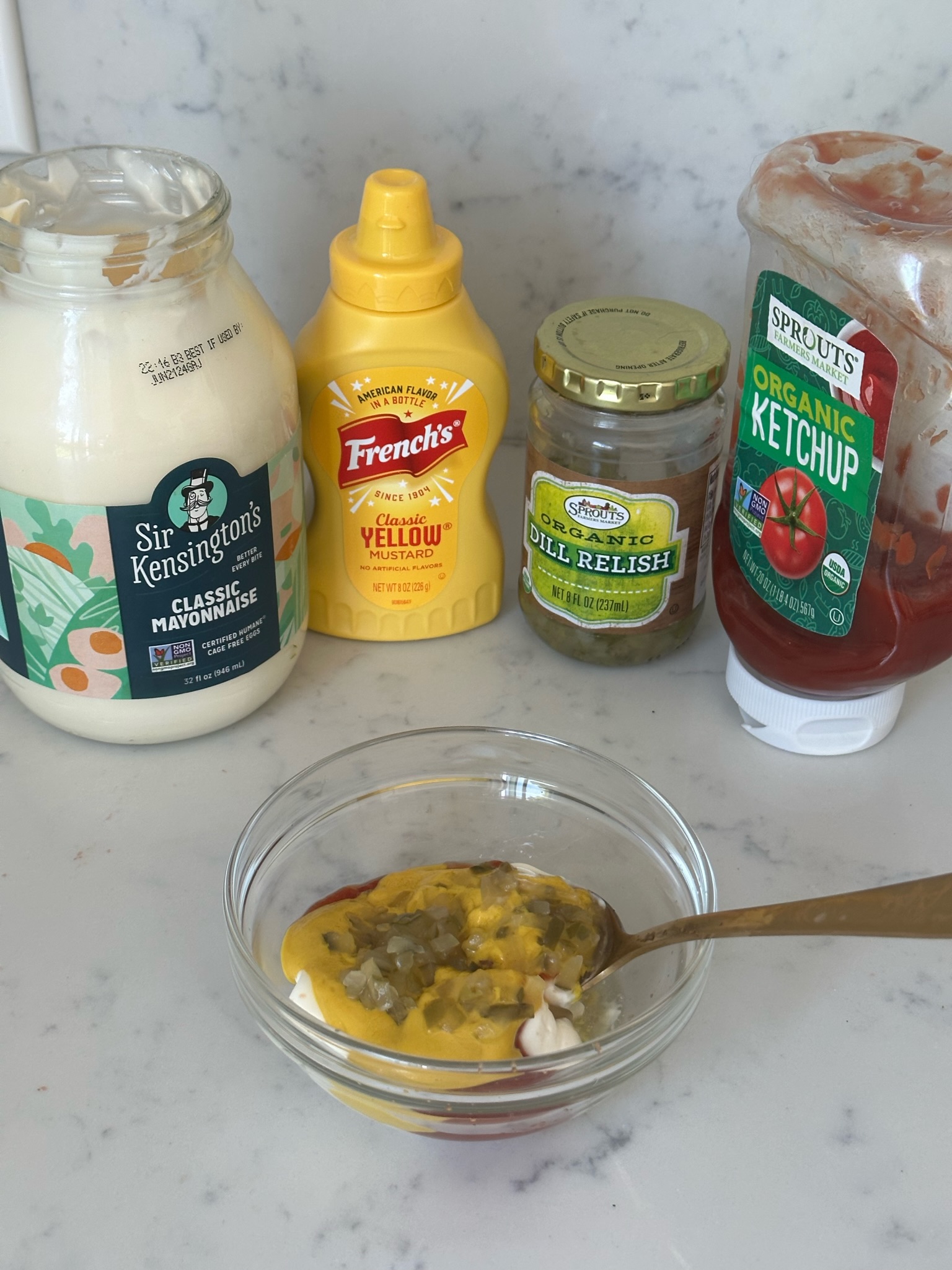 While the patties are cooking, prepare the sauce by combining mayo, ketchup, mustard, relish, salt, and pepper in a small bowl.