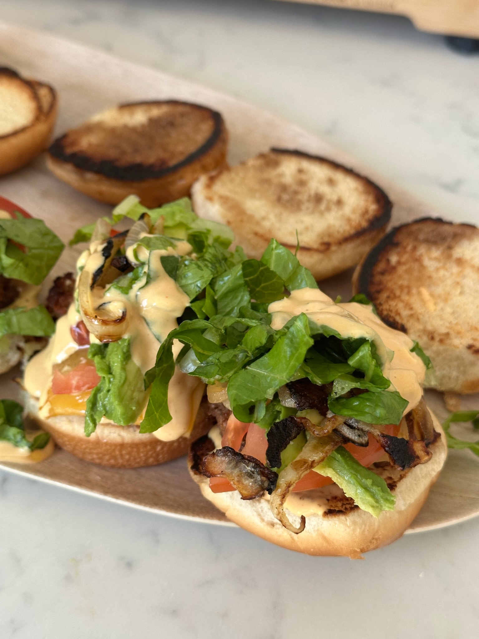 Now it's time to assemble your sliders! Spread the prepared sauce on the toasted buns, then add the patties with melted cheese. Top with tomato, avocado, caramelized onions, and more sauce if desired.