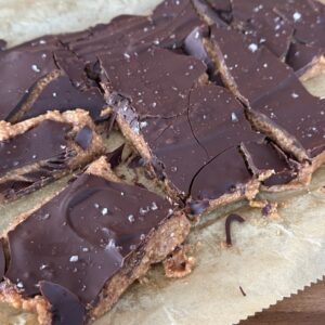 Pour the melted chocolate over the nut butter base, spreading it evenly. Sprinkle with flaky sea salt.