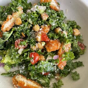 A delicious, protein-packed twist on the classic Caesar salad! This Elevated Kale Caesar is loaded with crispy chickpeas, savory chicken tenders, and creamy dressing for a flavorful, satisfying meal.