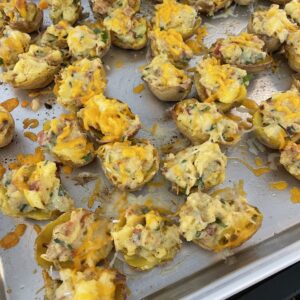 Slice the boiled potatoes in half and use a spoon or melon baller to carefully scoop out the insides, leaving a thin layer around the edge so they hold their shape.